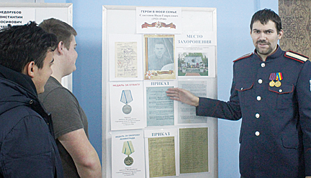 Молодому поколению были продемонстрированы презентация и выставочные стенды о защитниках Отечества. А.Ю. Гвалдин продемонстрировал стенд с подробным рассказом о Герое Советского Союза, полном Георгиевском кавалере Константине Иосифовиче Недорубове.