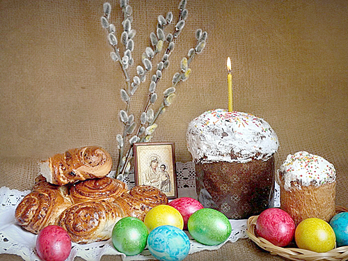С Пасхой связан прекрасный обычай целовать друг друга (христосоваться), знаменующий собой подражание древнему лобзанию мира и святой любви (Рим. I6, I6). Обычай дарить красные яйца ведет начало от Марии Магдалины, которая по вознесении Господнем пришла в Рим для проповеди Евангелия и, представ перед императором Тиьерием, подала ему красное яйцо со словами «Христос Воскрес», таким образом начала свою проповедь. Яйцо – символ жизни, красный цвет – кровь Христа, который даровал воскресением жизнь вечную.