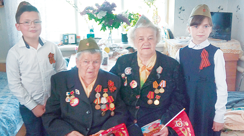 С особым волнением ребята посетили и сердечно поздравили также Зою Сергеевну Шутову, узницу концлагеря, ребенком перенесшую весь ужас фашистских застенков и чудом выжившую в адском пекле войны. Матвей Чеботарев и Дарья Хамракулова искренне и проникновенно читали стихи о победном мае, о героизме простых людей в годы войны, вручали ветеранам георгиевские ленточки, цветы, флажки, пилотки, прикрепили памятные значки и пожелали им здоровья и долгих лет жизни. Визит детей стал радостным событием для наших земляков. Прощаясь с ними, дети благодарили ветеранов за Победу и мирное небо над головой.