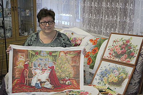 Ее дом похож на картинную галерею. Сегодня она уже точно и не вспомнит, когда начала переносить красоту природы или мгновение жизни на полотно. Крестик за крестиком, ряд за рядом, долгими вечерами вышивает она картины, воссоздавая старинные русские традиции. Когда-то вот также после захода солнца девицы и женщины собирались все вместе, вели долгие разговоры и вышивали.