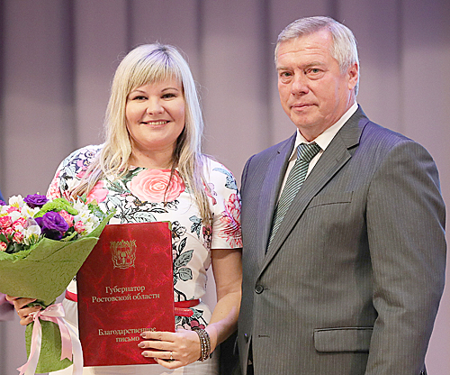 Василий Юрьевич вручил высокие награды Губернатора области. От Аксайского района была награждена благодарственным письмом за многолетнюю эффективную деятельность в системе образования Ростовской области заместитель начальника Управления образования Администрации Аксайского района Наталья Анатольевна Пастухова.