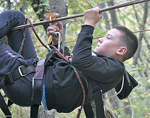 Школьники проходили параллельные перила, спускались и поднимались по отвесному склону оврага с самостраховкой на схватывающем узле или спусковом устройстве. Проще говоря – ребята привязывали к дереву веревку, обвязывались, цепляли карабин и спускались, держась за эту самую веревку.