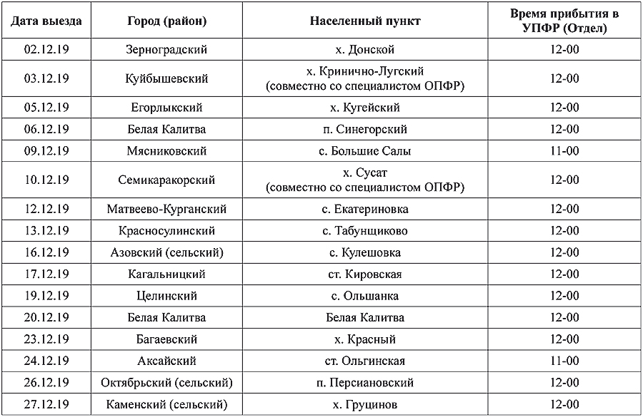 График выездов мобильной клиентской службы ОПФР по Ростовской области в декабре 2019 года