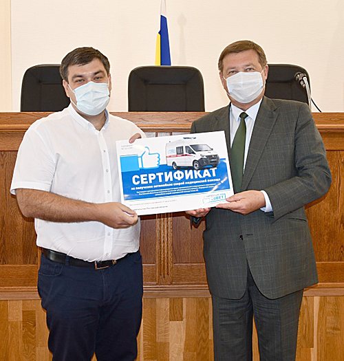 По поручению главы региона глава Администрации Аксайского района Виталий Иванович Борзенко вручил сертификаты на санитарный автотранспорт заместителю главного врача ЦРБ Аксайского района по медицинской части Павлу Анатольевичу Бекетову. После оформления необходимых документов районная больница получит три автомобиля «Лада Ларгус», автомобиль «Нива» и машину скорой медицинской помощи.