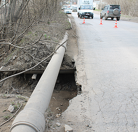 Край асфальта буквально нависает над уклоном. В темное время суток опасный обрыв можно просто не увидеть. Одно неверное движение водителя, и колесо автомобиля попадет в образовавшееся отверстие. Хорошо, если транспортное средство не улетит вниз к ручью.