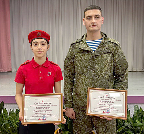 Тесное сотрудничество отряда с Героем России А.А. Афанасьевым породило идею обратиться с ходатайством в Министерство обороны РФ о присвоении его имени отряду «Звезда». 13 декабря 2024 года ходатайство было удовлетворено, и на районном юнармейском слете командир отряда Лилия Адамян получила свидетельство о присвоении отряду имени героя России А.А. Афанасьева. / ФОТО из архива гимназии