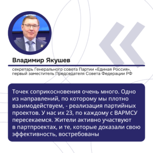 – Одно из направлений, по которому мы плотно взаимодействуем, — реализация партийных проектов. У нас их 23, по каждому с ВАРМСУ пересекаемся. Жители активно участвуют в партпроектах, и те, которые доказали свою эффективность, востребованы. До 2026 года все они продолжат свою работу, а после – могут быть перезагружены или перестанут действовать, – заявил Владимир Якушев.