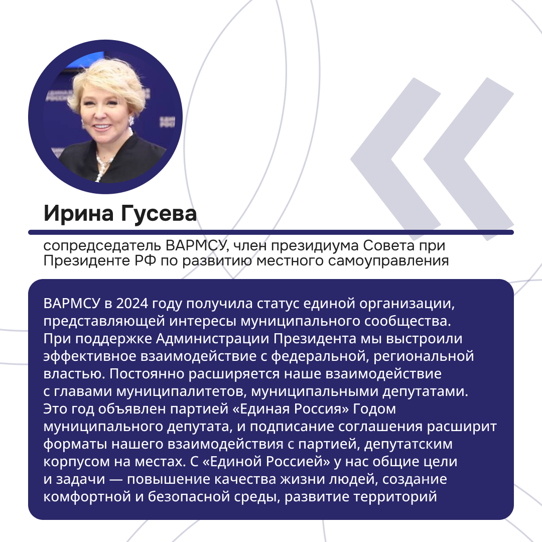 – ВАРМСУ в 2024 году получила статус единой организации, представляющей интересы муниципального сообщества. При поддержке Администрации Президента мы выстроили эффективное взаимодействие с федеральной, региональной властью. Постоянно расширяется наше взаимодействие с главами муниципалитетов, муниципальными депутатами. Это год объявлен партией «Единая Россия» Годом муниципального депутата, и подписание соглашения расширит форматы нашего взаимодействия с партией, депутатским корпусом на местах. С «Единой Россией» у нас общие цели и задачи – повышение качества жизни людей, создание комфортной и безопасной среды, развитие территорий, – сказала Ирина Гусева.