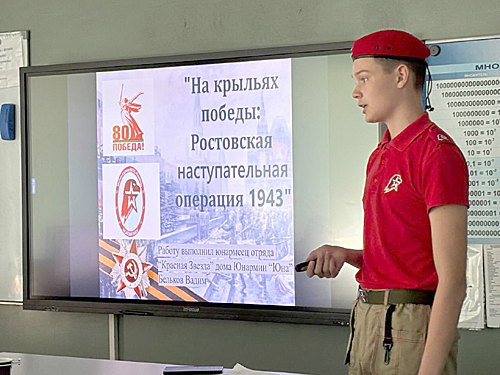 Мероприятие прошло в теплой, дружеской обстановке. Победителями стали юнармейцы: Алиса Пастарнак (секция «Дети – герои Ростовской области»), Вадим Бельков (секция «Основные операции и крупные сражения»), Яна Абелян (секция «Неизвестные герои»), Михаил Сухарев (секция «Деятельность в тылу»).