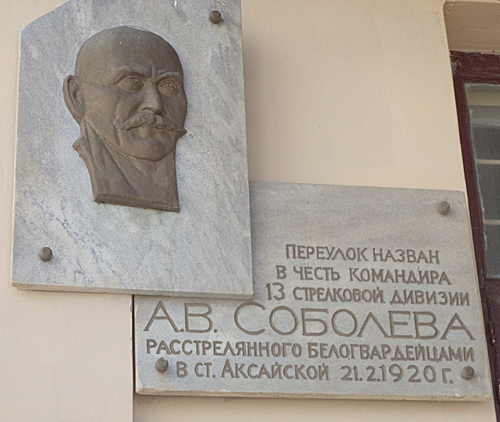 На пересечении улиц Гулаева и Соболева на видном месте – доска с вывеской «Переулок назван в честь командира 13 стрелковой дивизии А.В. Соболева, расстрелянного белогвардейцами в ст. Аксайской 21.02.1929 г.» Об этом храбром командире тоже есть материалы в музее.