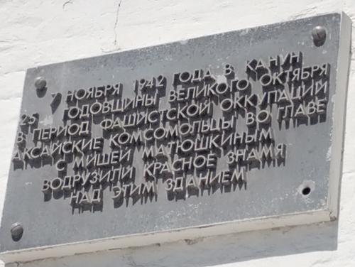 И вот теперь о молодогвардейцах. Перейдя на нечетную сторону улицы, на здании бывшей церковно-приходской, позже вечерней школы, видим еще одну мемориальную доску, текст ее гласит: «7 ноября 1942 года, в канун 25-й годовщины Великого Октября, в период фашистской оккупации, аксайские комсомольцы во главе с Мишей Матюшкиным водрузили Красное Знамя над этим зданием».