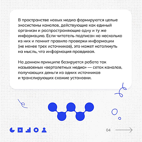 Раньше было правило трех источников для проверки информации. Сейчас источников должно быть 5, 7 и более. Потому что есть, допустим, сеть из различных пабликов и чатов, которая публикует одни и те же фейки. У них будут разные говорящие головы, но финансирование и установки они будут получать из одного центра (например, какого-нибудь «иностранного фонда»). Обычному человеку будет очень сложно это определить.