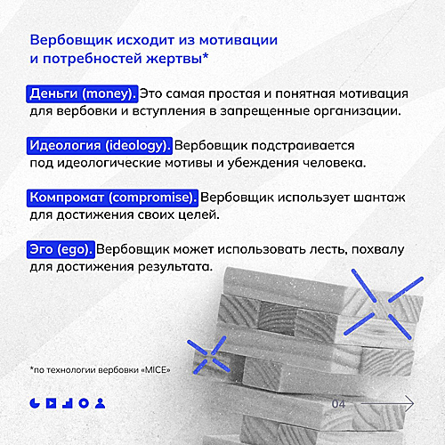 Вербовщики используют разнообразные психологические и социальные методы для привлечения новых членов в свои ряды. Они играют на чувствах одиночества, страха или неудовлетворенности, предлагая простое решение в виде своей идеологии. Могут обещать быстрое решение жизненных проблем, карьерный рост или личное развитие.