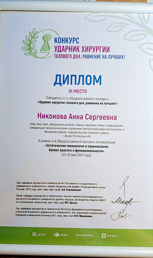 С 23 по 25 мая 2025 года в рамках IV Общероссийской прогресс-конференции «Эстетическая гинекология и перинеология: баланс красоты и функциональности» состоялся Общероссийский конкурс «Ударник хирургии тазового дна: равнение на лучших». В результате профессионального состязания А.С. Никонова заняла почетное III место.