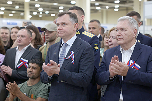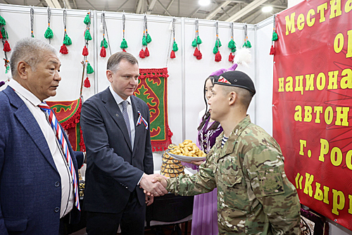 Юрий Борисович Слюсарь познакомился с выставками, посвященными национальным культурам и особо отметил стенды общественных организаций, которые оказывают помощь бойцам.