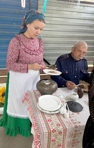 Тем временем, в беседке рядом с амфитеатром развернулось представление от СДК п. Пчеловодный «Казачий обряд – рождение в семье девочки. Родильная каша». Оказывается, при рождении девочки отец должен был съесть специальную «отцовскую кашу», которая готовилась с особым смыслом. Каша делалась острой, горькой, часто была пересоленной и даже подгоревшей. Казак обязан был съесть ее всю до последней ложки, не показывая недовольства. Считалось, что чем мужественнее отец перенесет эту «потеху», тем легче будет жизнь его дочери. На «Ярмарке семейных традиций – 2025», конечно же, кашу предлагали отведать вкуснейшую, не пересоленную и не перченную, но для желающих попробовать именно «родильную», соль с перцем на столе присутствовали.