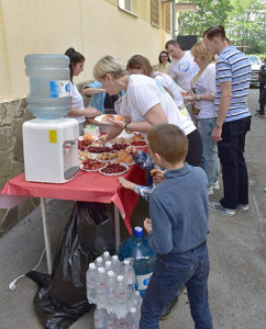 Недалеко от беседки другая «вкусная» зона со сладким столом, фруктами и соками, а рядом уже готовую уху разливает по чашкам сама хозяйка ярмарки – директор Центра помощи детям И.А. Ремишевская. У которой семья – тоже замещающая, Ирина Алексеевна вырастила помимо двоих своих, двоих приемных детей. И которая сама вместе со своим супругом уху и сварила!