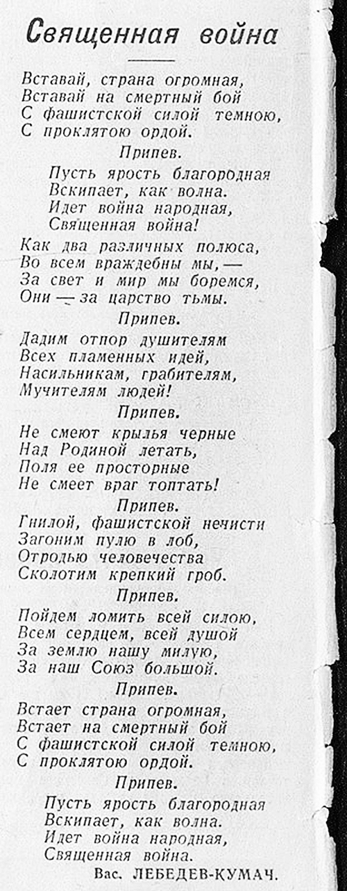 История создания этой песни началась двумя днями ранее. 24 июня 1941 года в газетах «Известия» и «Красная звезда» было опубликовано стихотворение В.И. Лебедева-Кумача, начинавшееся словами «Вставай, страна огромная». Руководитель Краснознаменного ансамбля песни и пляски Красной Армии А.В. Александров, прочитав эти строки, был настолько потрясен их силой и глубиной, что сразу же приступил к написанию музыки.