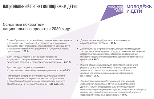 Уже за время реализации нацпроекта удалось создать целостную систему поддержки молодого поколения. Появились новые форматы образования, развились молодежные инициативы, укрепилось здоровье детей, повысилась их социальная активность. Молодые люди получили больше возможностей для самореализации и развития своих способностей.