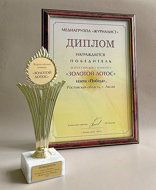 В рамках делового форума прошла церемония награждения Знаком отличия «Золотой фонд прессы – 2025» лучших печатных и сетевых изданий России, подведены итоги профессиональных конкурсов. Газета «Победа» Аксайского района в очередной раз стала обладателем этого Знака отличия «Золотой фонд прессы» первой степени, получив высокую оценку экспертного совета. Кроме того, коллектив редакции газеты «Победа» стал победителем и Всероссийского конкурса «Золотой лотос», призванного содействовать пропаганде и сохранению культурного наследия, самобытности народов и этносов России, укреплять в общественном сознании граждан идеи духовного единства российско- го народа, межнационального согласия.