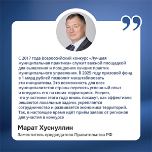 – С 2017 года Всероссийский конкурс «Лучшая муниципальная практика» служит важной площадкой для выявления и поощрения лучших практик муниципального управления. В пяти номинациях – «Градостроительная политика и развитие ЖКХ», «Управление территорий», «Бренд территорий», «Умный город», «Укрепление межнационального мира и согласия» – мы отбираем проекты, меняющие жизнь территорий к лучшему. В 2025 году призовой фонд в 1 млрд рублей позволит масштабировать эти инициативы. Это возможность для всех муниципалитетов страны перенять успешный опыт и внедрить его на своих территориях. Уверен, что участники этого года вновь покажут, как эффективно решаются локальные задачи, укрепляется сотрудничество и развивается экономика территорий. Так, в настоящее время идёт приём заявок от регионов для участия в конкурсе, – отметил заместитель председателя Правительства России Марат Хуснуллин.