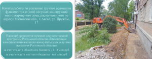 – В рамках мероприятия по предоставлению субсидии по капитальному ремонту администрацией Аксайского городского поселения заключено соглашение с некоммерческой организацией «Ростовский областной общественно полезный фонд содействия капитальному ремонту» на предоставление субсидии в размере 6,6 млн руб. на обеспечение мероприятий по капитальному ремонту многоквартирного дома, по адресу: г. Аксай, ул. Дружбы, 17 для проведения работ по усилению грунтов основания фундаментов и несущих конструкций. При проведении технического обследования данного многоквартирного дома установлено, что он является ограниченно работоспособным. В 2025 году дом включен в государственную программу Ростовской области «Обеспечение качественными жилищно-коммунальными услугами населения Ростовской области», усиление в нем производится за счет областных средств в сумме 41,2 млн руб. при софинансировании местного бюджета в сумме 6,6 млн руб., – отметил Е.Н. Камфарин.