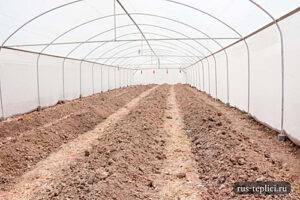 При полной замене грунта полностью удаляют весь старый грунт на глубину 30–40 см. Вместо него вносят новый питательный субстрат, как при частичной замене, укладывают при необходимости дренажный слой (песок, щепа, гравий). Затем следует перекопать теплицу и пролить биофунгицидом или горячей водой.
