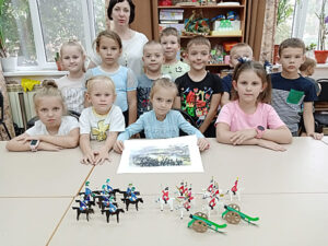 Руководитель студии «Радуга творчества» Наталья Вячеславовна Черных рассказала детям о Бородинском сражении между французской и русской армией, о командующих армиями Наполеоне Бонапарте и Михаиле Илларионовиче Кутузове.
