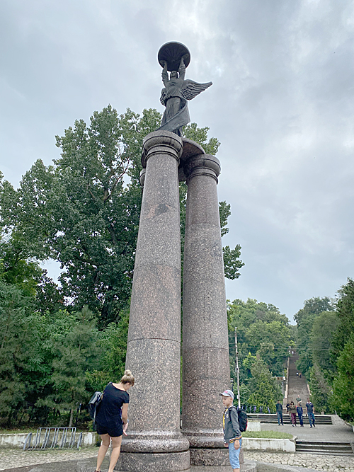 Интересный факт: изначально проект предполагал установку на вершине колонн фигуры чайки – символа, связанного как с морским расположением города, так и с чеховской пьесой «Чайка». Однако в итоге было принято решение установить скульптуру ангела-хранителя. Автором этой части памятника стал ростовский скульптор Д. Р. Бегалов, который также создал для Таганрога памятник «Человек в футляре».