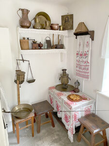 Кухня тоже небольшая. Пол здесь глинобитный, печь – тоже. В кухне готовили пищу, а печь еще и обогревала дом. Кроме деревянной посуды, в кухне представлена латунная и медная посуда, которая в середине XIX века была доступна в крупном портовом городе на Азовском море. На полке стоит деревянная формочка для приготовления творожной пасхи. Эта формочка принадлежала матери писателя Евгении Чеховой.