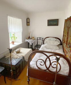 Самая маленькая комната в домике, вмещавшая только родительскую кровать, колыбельку, где спал маленький Антон, и комод, – спальня родителей писателей. Здесь же фото крестного Чехова – Спиридона Титова и изображение Успенского собора, в котором крестили маленького Антошу.