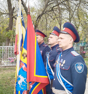 Стихли голоса и под звуки гимна Всевеликого войска Донского знаменная группа юрта, чеканя шаг, внесла знамена казачьи знамена. После молитвы и поздравления с праздником, была объявлена минута молчания в память о казаках-героях, павших в сражениях за свободу и независимость России, за честь и славу Дона.