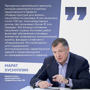 – В них включено почти 728 тысяч многоквартирных домов, где проживают более 91 млн граждан. Это больше половины населения страны. Комплекс работ включает обновление ключевых элементов: инженерных коммуникаций, кровли, фасадов и лифтового оборудования. Это необходимо для поддержания эксплуатационных характеристик зданий и предотвращения их преждевременного старения, – подчеркнул вице-премьер.