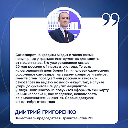 – Самозапрет на кредиты входит в число самых популярных у граждан инструментов для защиты от мошенников. Его уже установили свыше 20 млн россиян с 1 марта этого года. То есть на сегодняшний день более 1 млн человек ежемесячно оформляют самозапрет на выдачу кредитов и займов. Вместе с тем порядка 1 млн россиян установили самозапрет на выдачу новых СИМ-карт. Так, в случае утери документов или других инцидентов у злоумышленников не получится оформить СИМ-карту на имя человека и, как следствие, использовать ее в мошеннических схемах. Сервис доступен с 1 сентября этого года, – сообщил заместитель председателя Правительства РФ Дмитрий Григоренко.