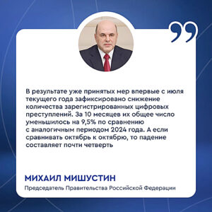 – В результате уже принятых мер впервые с июля текущего года зафиксировано снижение количества зарегистрированных цифровых преступлений. За 10 месяцев их общее число уменьшилось на 9,5% по сравнению с аналогичным периодом 2024 года. А если сравнивать октябрь к октябрю, то падение составляет почти четверть, – сообщил Председатель Правительства РФ.