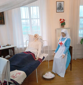 В одной из витрин представлены сундучок медицинской сестры нач. ХХ в. и традиционнаяформа сестры милосердия нач. ХХ в.: белые пелерина, фартук, косынка. Коричневые, серые, голубые сестринские платья стали для них «второй кожей». Требование «всегда и при всех обстоятельствах работать в форме» было наполнено глубоким внутренним содержанием и не являлось формальностью.