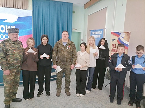 Встреча была очень теплой. Казачата 6 «А» класса показали литературно-музыкальную композицию «Сказ о казачьем державном войске», первоклассники приготовили сладкие подарки для бойцов, а старшеклассники написали трогательные письма.