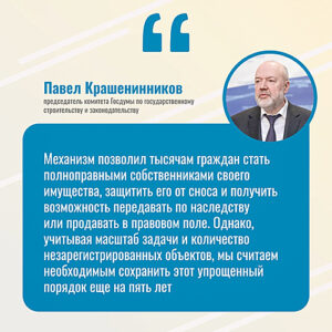 – Механизм позволил тысячам граждан стать полноправными собственниками своего имущества, защитить его от сноса и получить возможность передавать по наследству или продавать в правовом поле. Однако, учитывая масштаб задачи и количество незарегистрированных объектов, мы считаем необходимым сохранить этот упрощенный порядок еще на пять лет, – подчеркнул Петр Крашенинников.