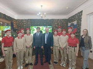 Глава Старочеркасского сельского поселения А.Г. Ягольник, директор Старочеркасского музея-заповедника А.В. Кляндин и юнармейцы отряда «Крепость» с советником директора Старочеркасской средней общеобразовательной школы Е.А. Панковой на открытии выставки «Защитники Отечества наших дней». / ФОТО автора