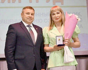 В день социального работника. К.С. Доморовский вручает Е.А. Бутенковой медаль «100 лет Аксайскому району». / ФОТО из архива Е.А. Бутенковой