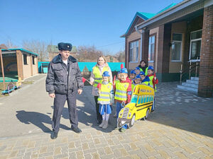 Вместе с инспектором по пропаганде БДД Дмитрием Гордеевым, командой ЮПИД «Янтарики», воспитателями и родителями дошкольники прошли по маршруту от порога садика. Инспектор напомнил детям правила перехода дороги по регулируемому и нерегулируемому пешеходному переходу, рассказав об опасностях, которые могут ожидать их по пути следования.