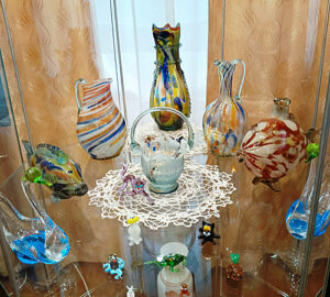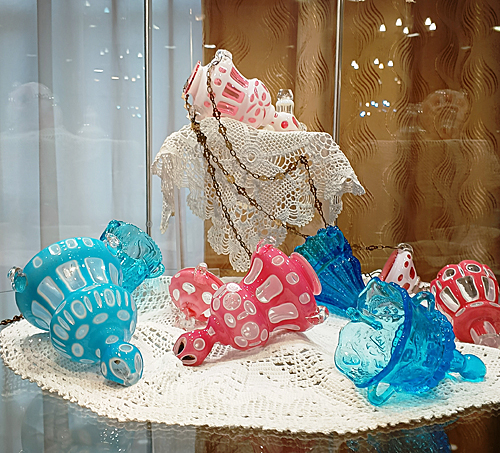 В витринах разместились удивительные по своей красоте музейные экспонаты: бокалы, вазы, графины, чайницы, парфюмерные флаконы, декоративные фигурки, керосиновые лампы, лампады, поражающие многообразием оттенков цветовой гаммы. Они чередуются на полках в соответствии с определенным цветом (синим, голубым, желтым, зеленым, красным). Яркий, насыщенный цвет живет в предмете, играет, пронизывает насквозь, бликуя на гранях, притягивает к себе внимание.
